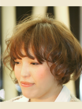 マニッシュな中にも女性らしい丸みのあるシルエットに。くせが強いのでカットで内に入るようにし小 顔効果も加えました。